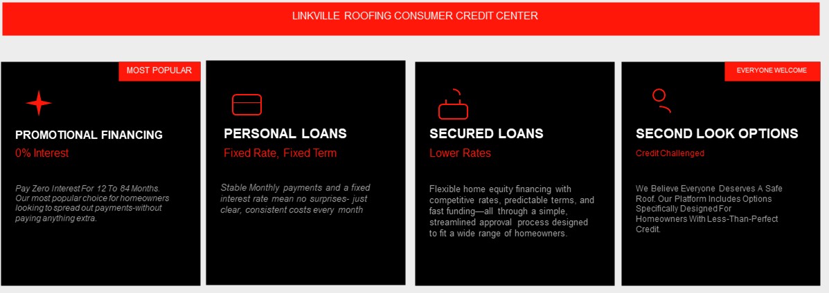 Through Linkville Roofing’s Consumer Credit Center, we provide flexible payment options designed to fit your budget—all handled right here by people you trust.
